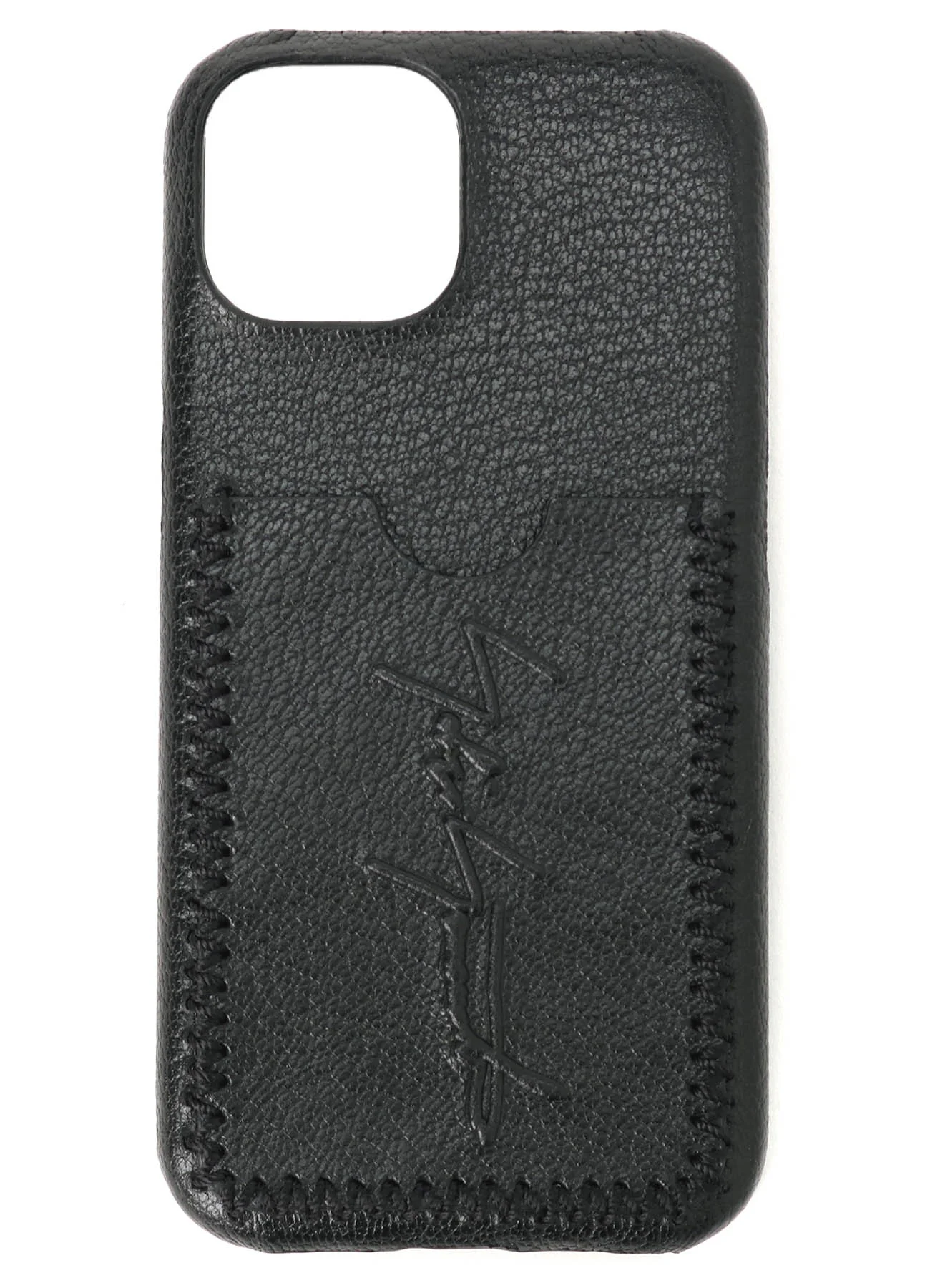 Policarbonate iPhone case adorned with luxurious shrink leather. The back features Yohji Yamamoto's signature and includes a card slot. Compatible with iPhone 14, iPhone 14 Pro, iPhone 15, and iPhone 15 Pro. Not suitable for other iPhone models or smartphones.