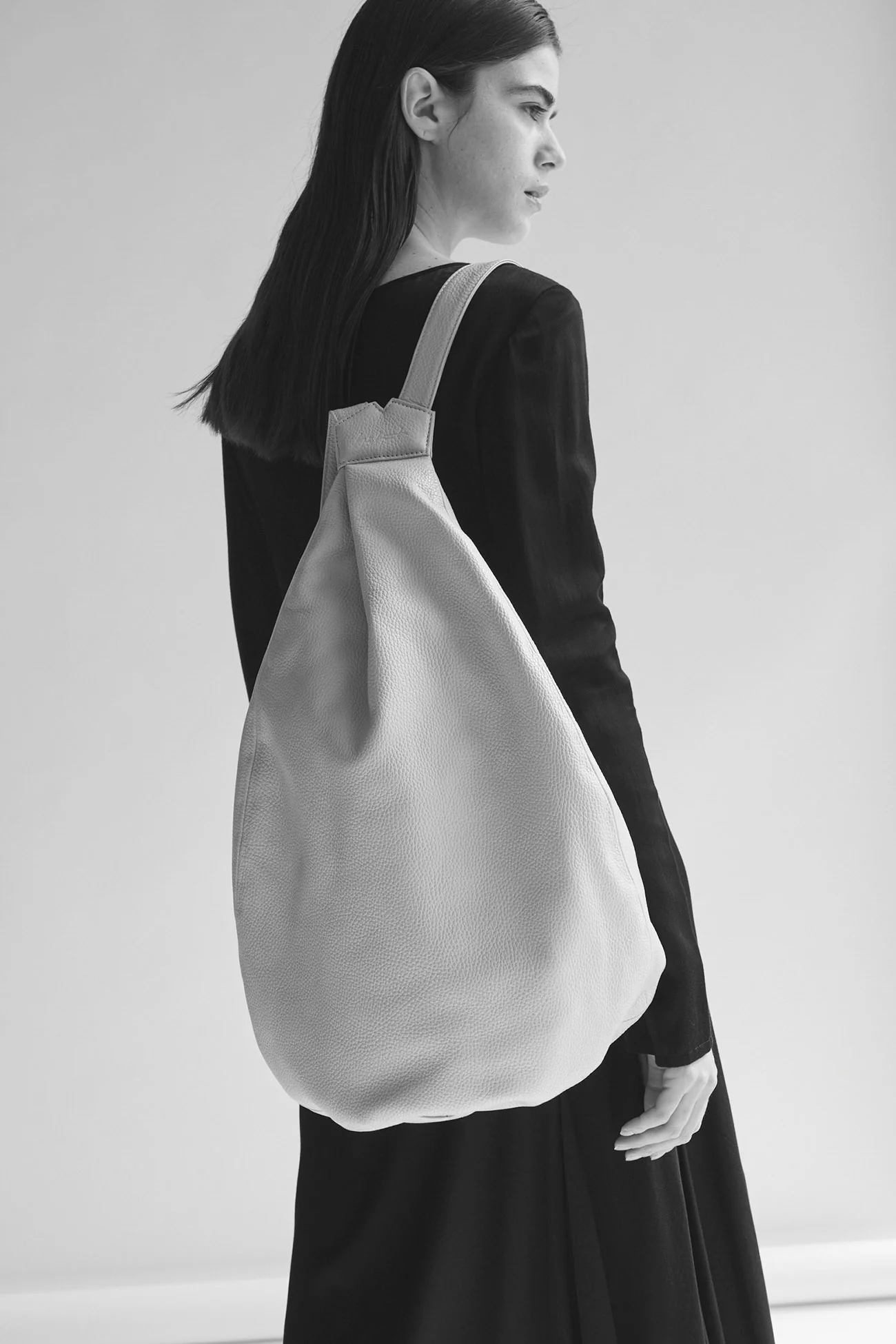 A signature unisex backpack from discord Yohji Yamamoto, featuring a unique design and crafted with soft, draped Italian shrink leather. Functional elements are concealed, providing high security and a sleek look. This backpack exemplifies a blend of style and functionality, enhanced with a thoughtful design to maintain its sophisticated silhouette.