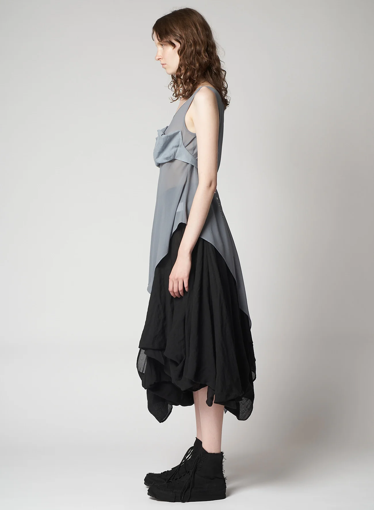 - Sleeveless and asymmetrical design.