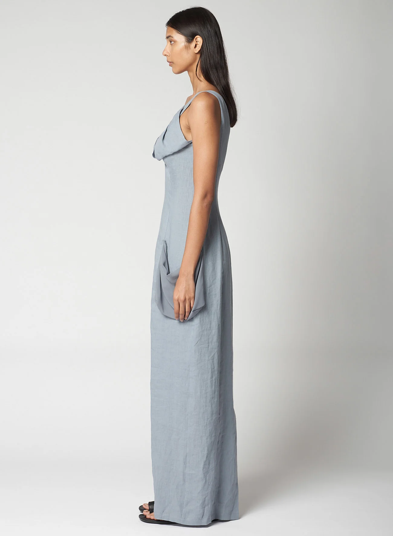 A long dress with an elegantly shaped waistline features a refreshing blue-gray color for a cool, stylish appearance. The silhouette, which narrows at the waist, accentuates the beauty of the body line.