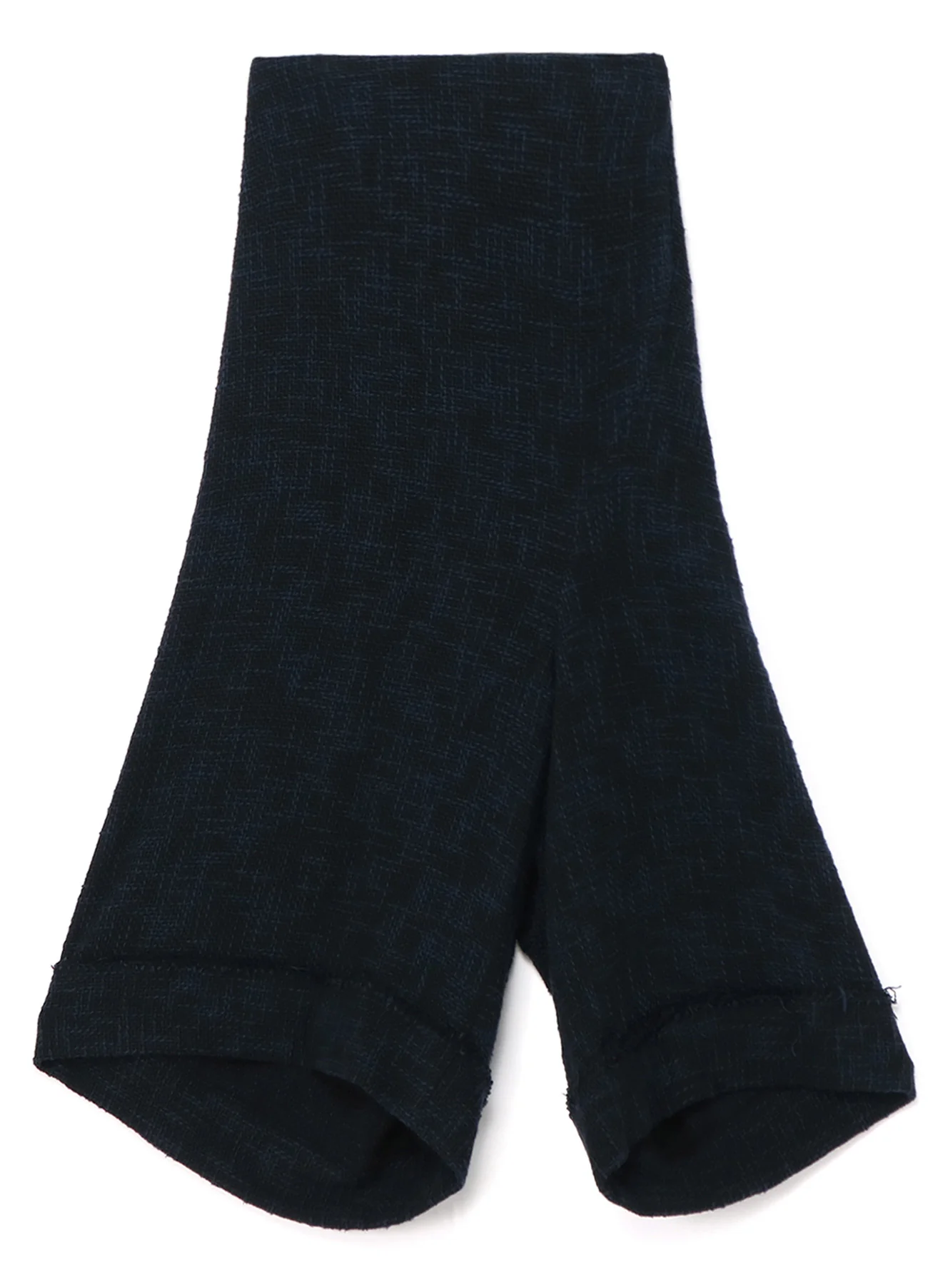 The asymmetric pants are crafted from a textured tweed material, designed to be a statement piece when paired with simple tops. They bring a unique flair to any outfit with their distinctive design and quality fabric.