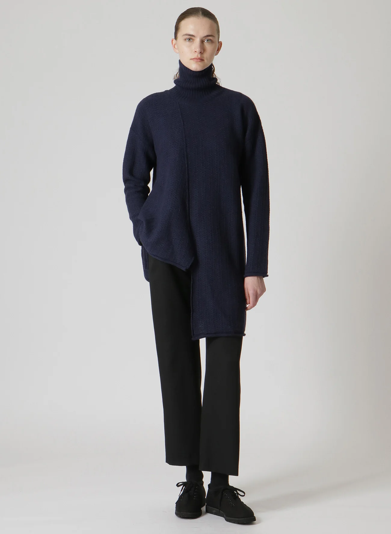 This lightweight and soft turtleneck knit features a complex texture created by a multitude of minute piles. These piles capture air within the yarn, making the material exceptionally light and voluminous. Designed with an asymmetric silhouette, this piece offers a complete outfit look on its own.