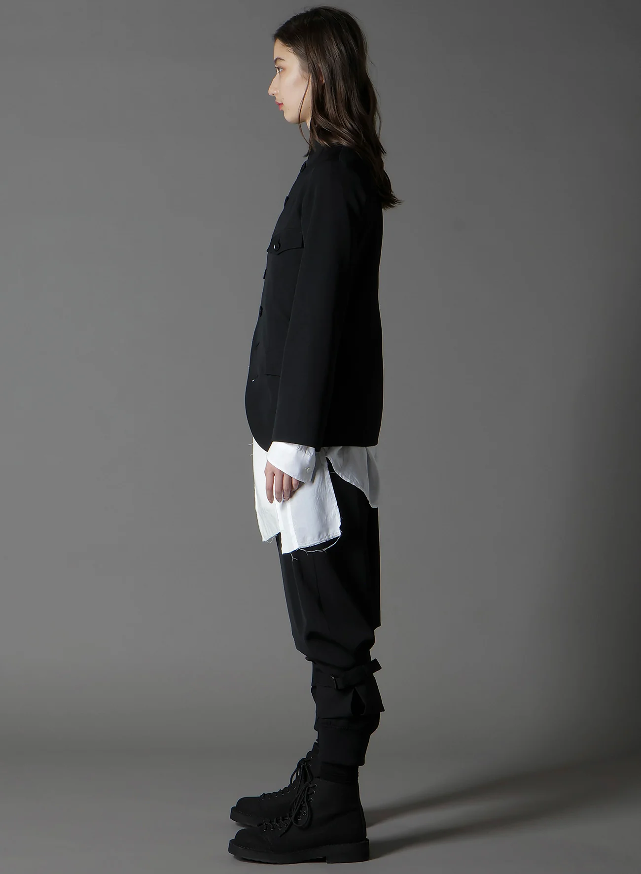 A military-style, short-standing collar jacket offering versatile styling by adjusting its collar buttons. Made with Yohji Yamamoto's signature wool gabardine, it exudes a refined, glossy look using strong-twist wool. The jacketās unique washer finish adds texture to the fabric.