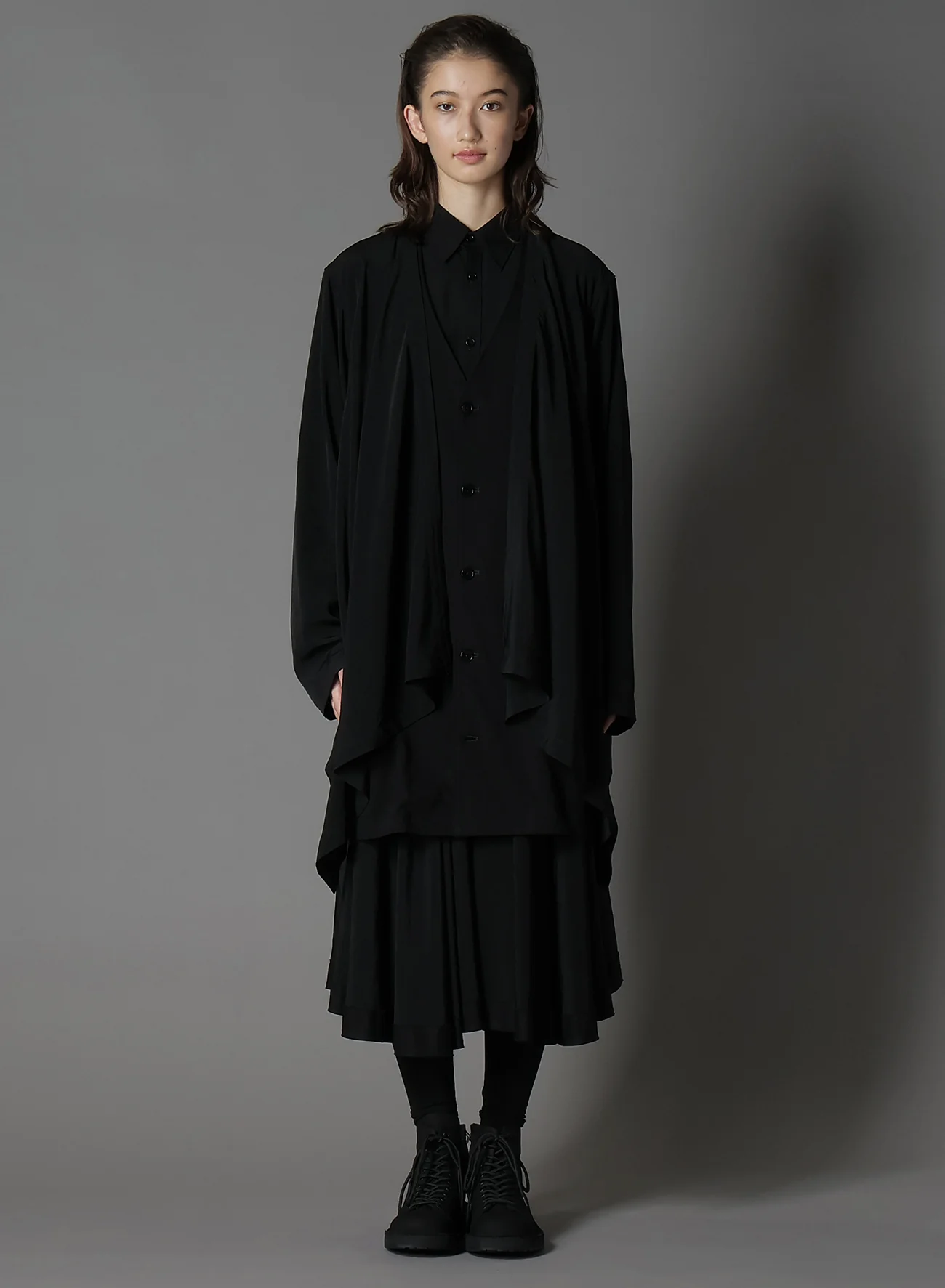 This top features a cardigan-layered look made with an abundant amount of crepe de Chine fabric, offering a beautiful drapery. The combination of 100% cotton and signature crepe de Chine provides a mild sheen and texture resistant to wrinkles, making it a versatile piece suitable all throughout the season.