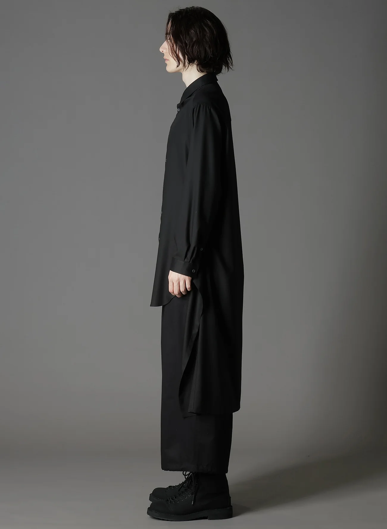 The 2025-26 Autumn/Winter Ground Y collection introduces a long shirt with dramatic length contrasts between front and back. Featuring side slits, it boasts dynamic fabric movement at the rear. The rayon-polyester blend fabric is densely woven, soft, and retains a gentle drapery typical of synthetic fibers.