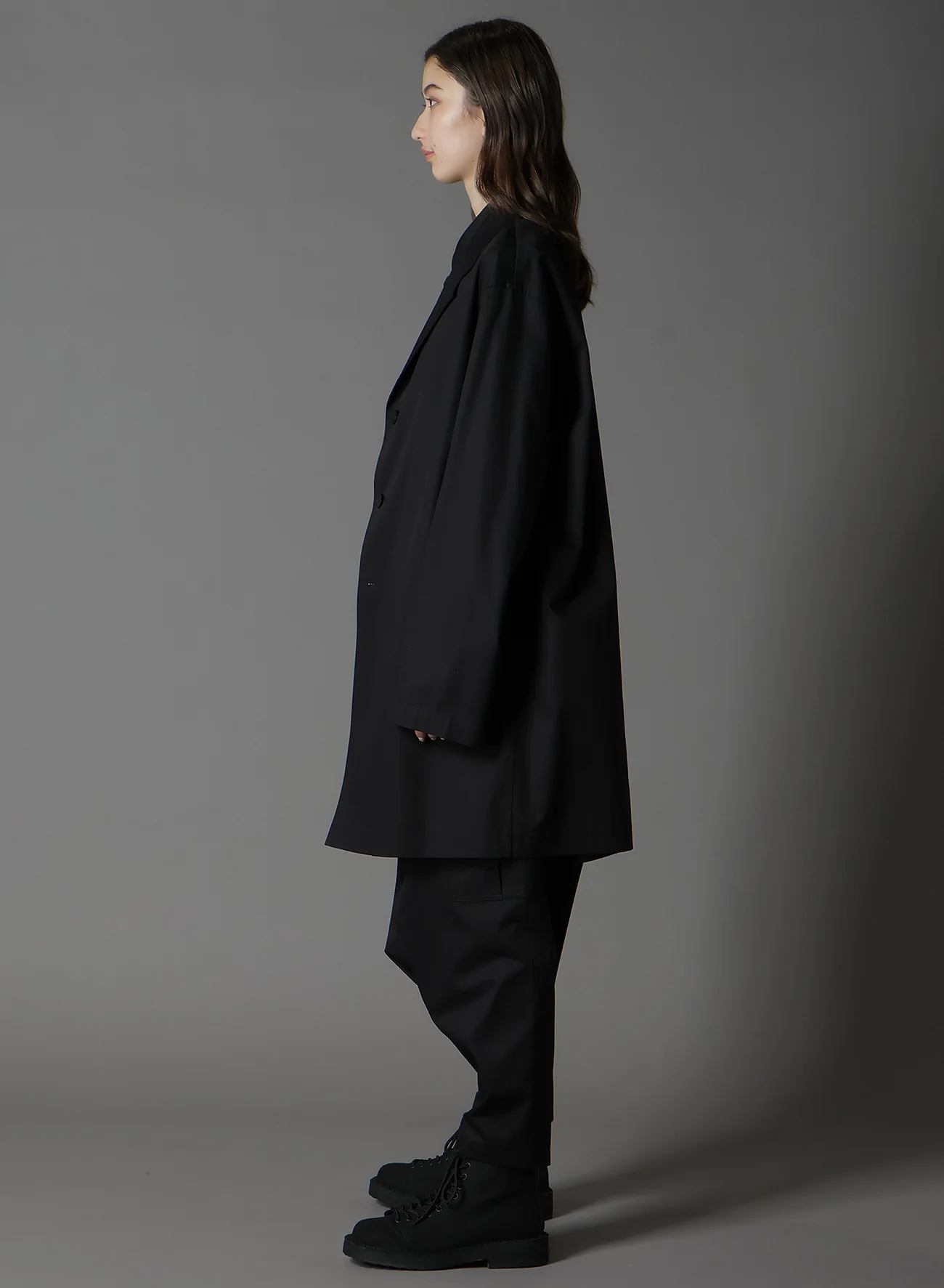This unique shirt jacket from Ground Y's Autumn/Winter 2025-26 collection is made with a less fuzzy, smooth, and glossy fabric. Combed yarn enhances strength, quality, and comfort with a sophisticated finish. The shirt-style tailoring instead of traditional jackets allows for better movement and a more comfortable fit.