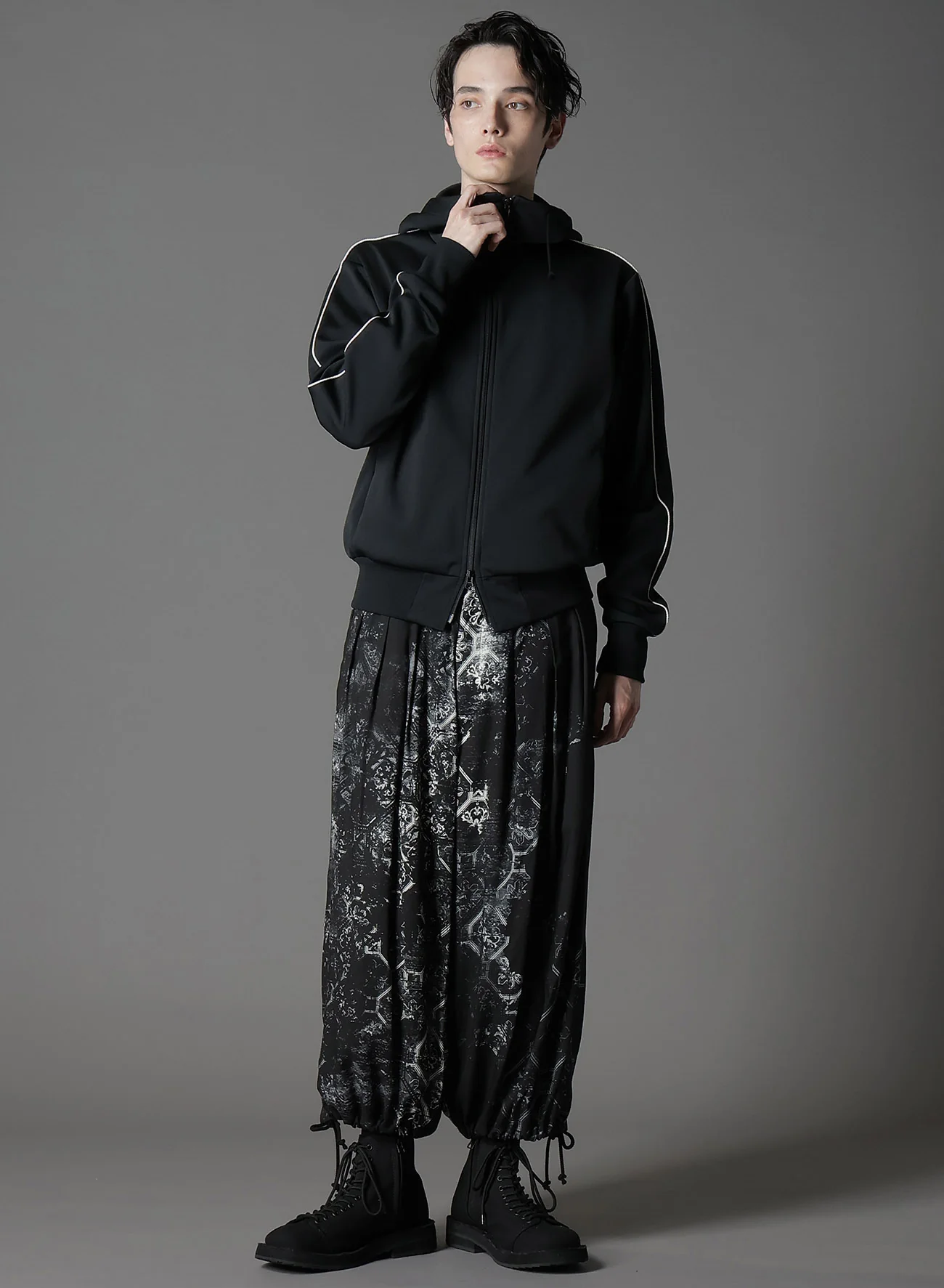 The Ground Y 2025 Spring/Summer Collection features a jersey track jacket with a small brand logo below the hood. Casually appealing yet refined with piping details, the design ensures itās not overly casual. Made from smooth, soft fabric, offering comfortable wear. Piping lines add a striking accent to the attire.