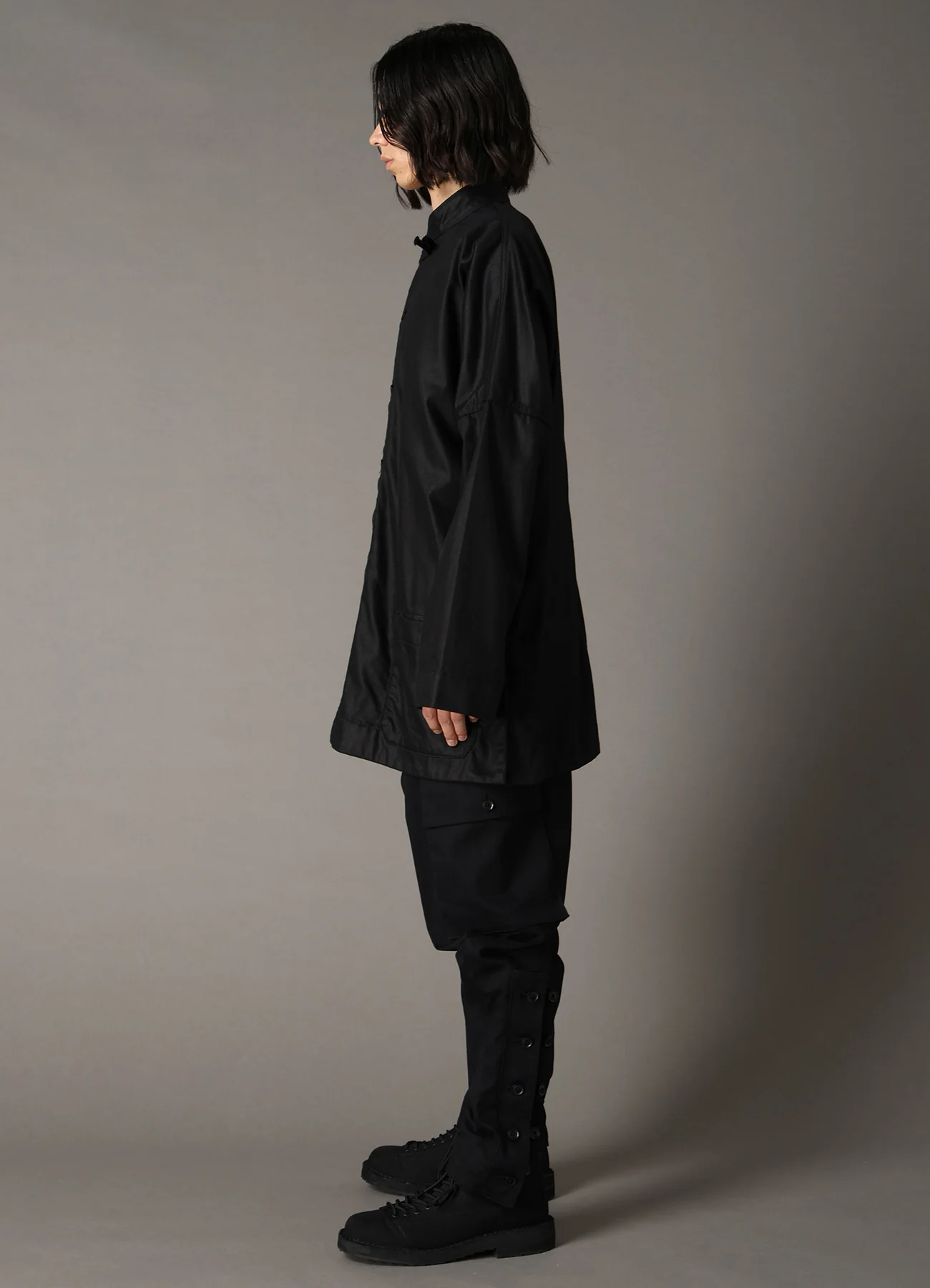 - Shirt jacket features a relaxed silhouette and standing collar.