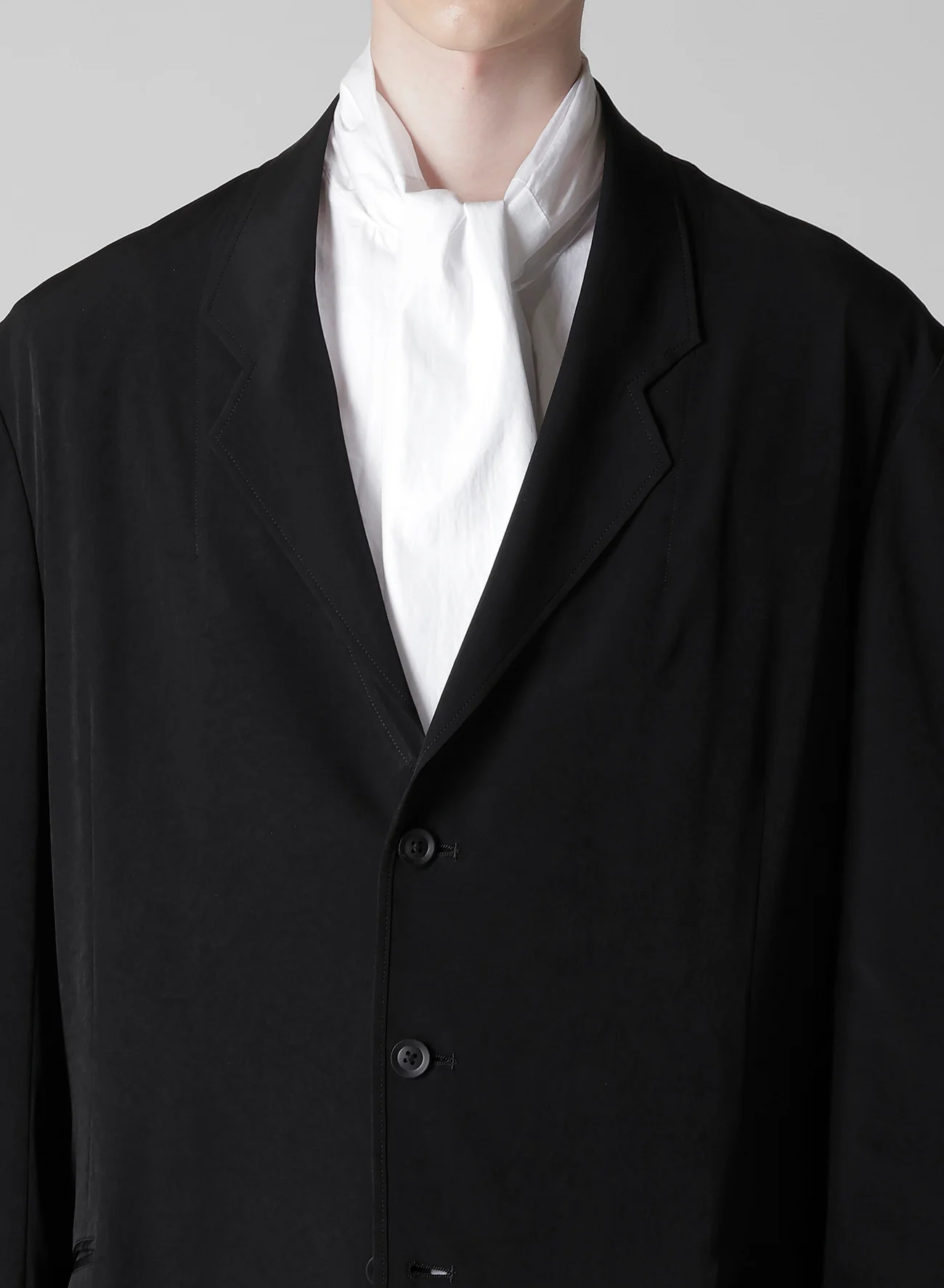 This jacket features a combination of triacetate and polyester material with a unique lapel design. The material, a signature of Yohji Yamamoto, is known for its mild gloss and luxurious feel. The plain weave, woven with tightly twisted weft yarns, gives the jacket a rich drapery.