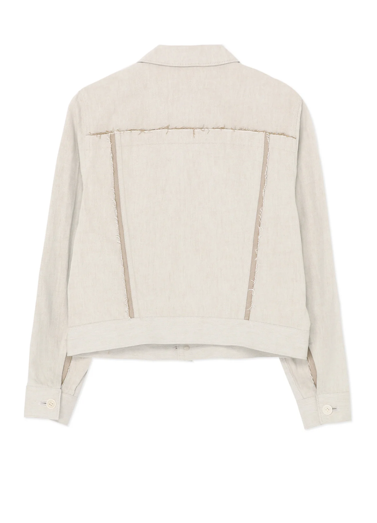 This jacket uses denim with different colors on the front and back. The design features large front pockets and a raw edge finish, making it a standout piece. Its minimal silhouette pairs well with any pants and can be worn both as outerwear or as a top by closing the front. Pair it with matching pants or a skirt for a complete set.