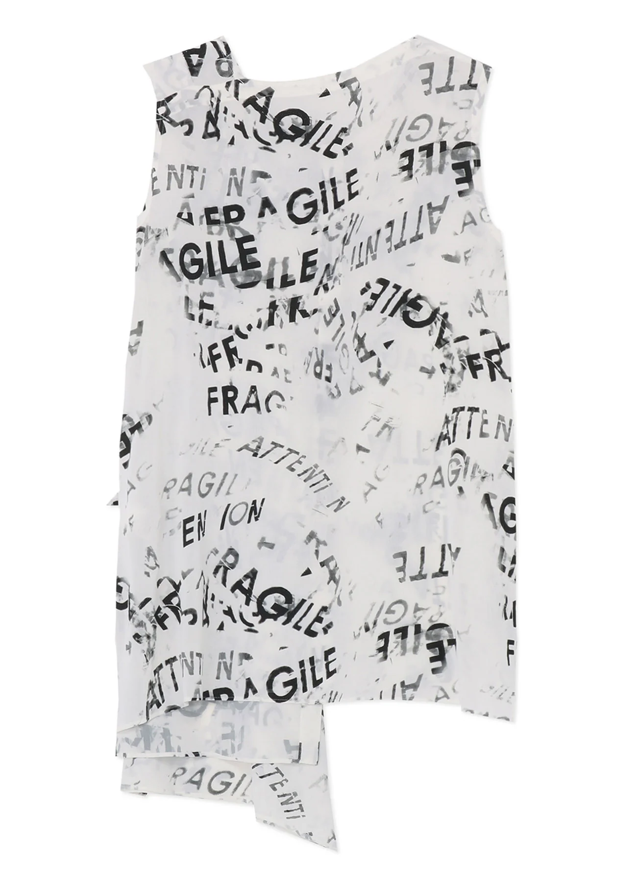 This sleeveless blouse, crafted from soft rayon with a textured feel, features a draped front and asymmetrical hem. The neckline and armholes are designed to keep inner wear discreet, and a hand-printed "ATTENTION FRAGILE" message adds impact. Ideal for versatile styling.